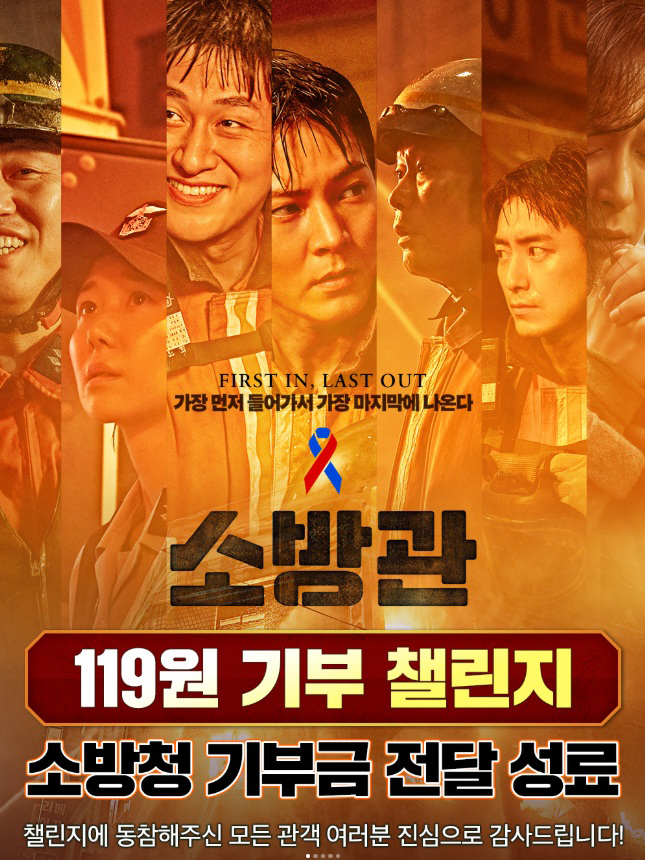 <소방관>의 마케팅 방식은 특히 눈길을 끌었다. 국내 소방관들의 처우 개선을 돕겠다며 관객 1명당 119원을 기부하는 ‘119 챌린지’ 캠페인을 해 주목받았다. 소방관들이 열악한 상황에서도 목숨 걸고 업무에 최선을 다하는 모습을 그린 영화 내용과 맞닿는 이벤트였다. 당초 바이포엠스튜디오는 개봉 일주일 후 캠페인을 전개하려 했으나, 개봉 전날(12월 3일) 벌어진 불법 계엄 사태가 변수가 되었다. 국가적 혼란에 따라 영화에 대한 관심이 줄 것을 우려해 ‘119 챌린지’를 바로 실시했다.