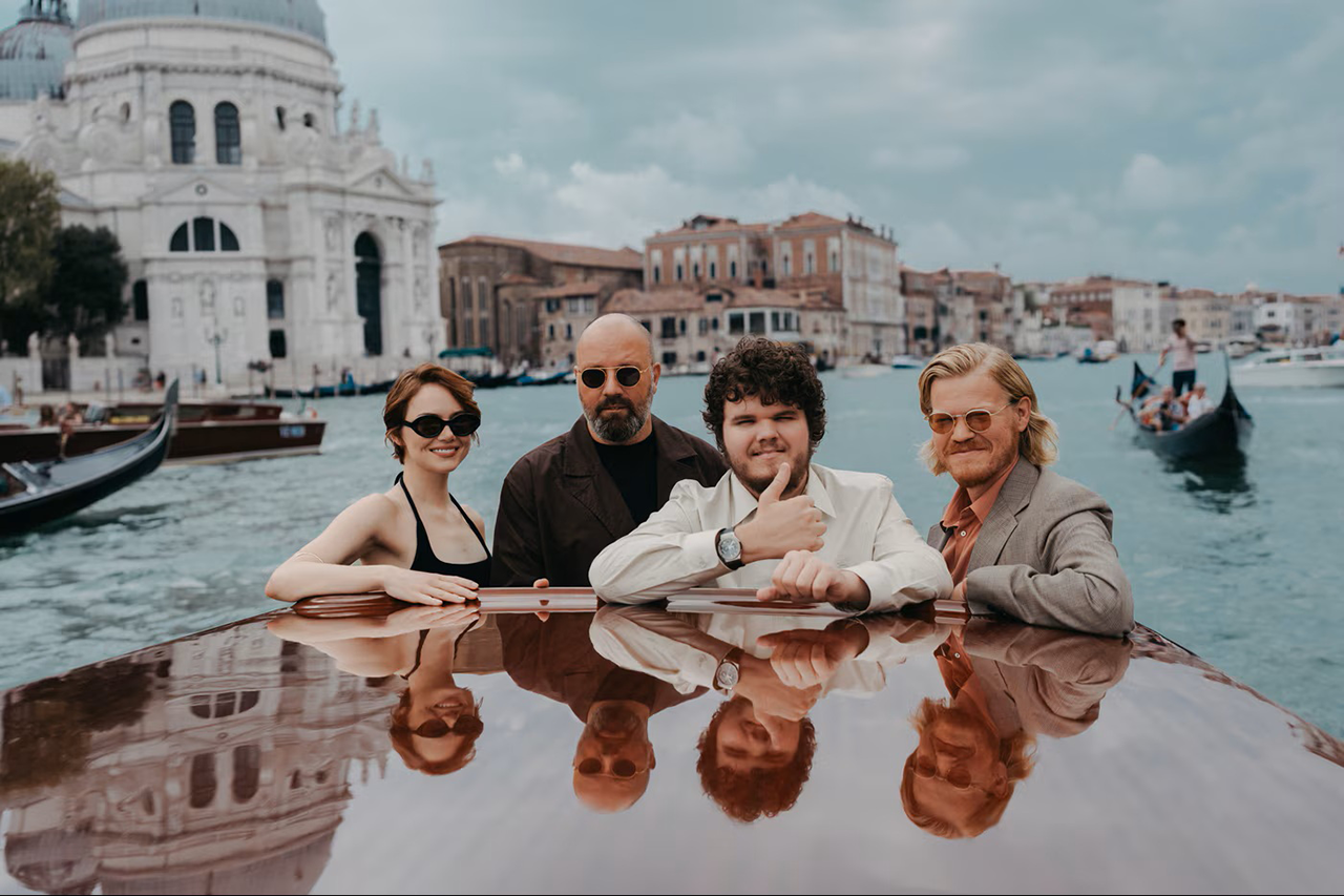 From left: Emma Stone, Director Yorgos Lanthimos, Aidan Delves, and Jesse Plemons