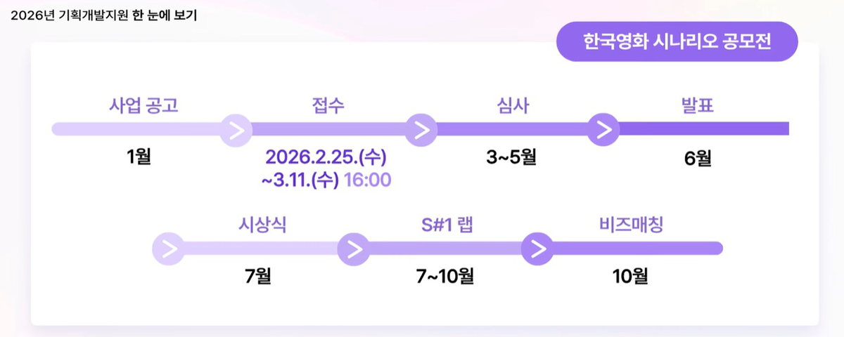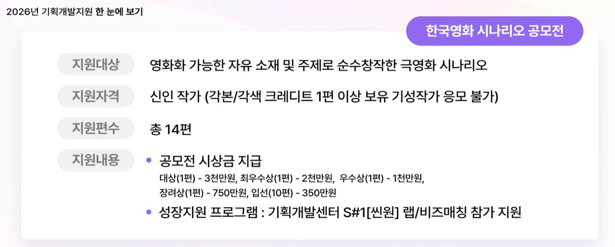 공모전 수상자는 S#1[씬원] 센터와 연계된 멘토링, 비즈매칭 프로그램에 참여할 수 있어 영화 산업 내로 진입해 정착하기까지 지원을 받게 된다. 신인 작가의 경우, 영화계에 대한 정보와 경험이 부족해 불공정한 일을 겪게 될 가능성이 높은데, 멘토링, 비즈매칭 프로그램을 통해 일종의 에이전시 서비스를 받을 수 있게 되는 것이어서 신인 작가에게 실질적인 도움이 될 것으로 보인다. S#1[씬원]은 영진위가 운영하는 기획개발센터로, 국내 유일 시나리오 아카데미 커리큘럼을 개설해 실력 있는 작가들을 배출하고 있다. ‘2026년 한국영화 시나리오 공모전’은 2026년 2월 25일(수)부터 3월 11일(수)까지 접수를 받는다.