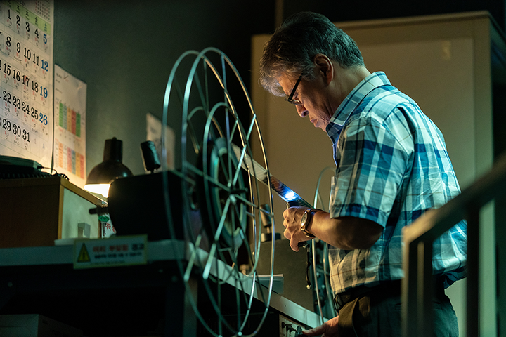 맞다. 홍성희 실장님은 씨네큐브가 생길 때부터 지금까지 일해오신 분이다. 1970년대부터 영사기사로 한국 아트영화 붐을 목도하신 분이시고, 70대이신데 현역으로 일하는 영사기사는 거의 실장님이 유일하시다. 장인처럼 성실하고 완벽주의적인 면이 있어서 저희도 많이 의지하는 분이기도 하고, 관객들이 영사 사고 없이 편하게 영화를 관람하게 해주시는, 씨네큐브의 중요한 스태프다. 이종필 감독님도 <침팬지> 촬영하러 왔을 때 홍성희 실장님에게 깊은 인상을 받았던 것 같다. 워낙 나서기를 싫어하시는 분이라 처음엔 부담스러워했지만 결국 설득되셨다.(웃음) 부산국제영화제에서 첫 공개됐을 때도 프롤로그·에필로그에 실장님의 등장이 주는 정서적 반응이 컸다.